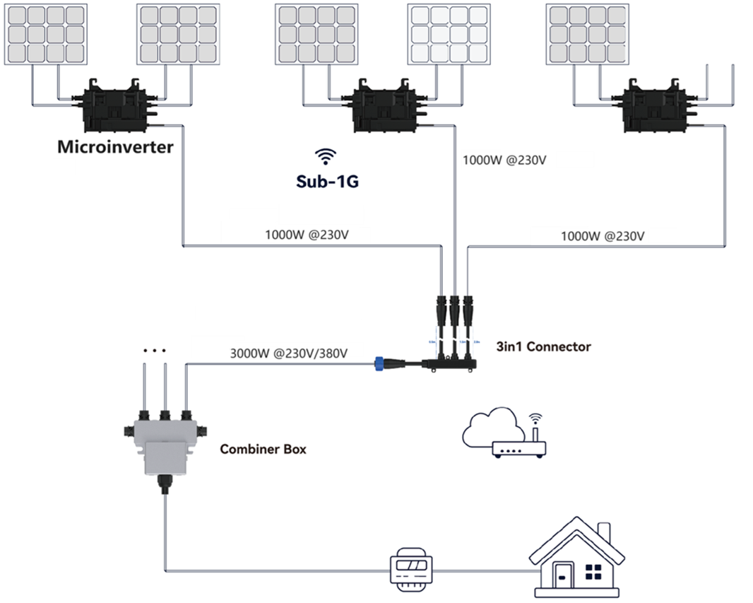 A combiner box can connect up to five 3 in 1 connectors.(15 Microinverters)