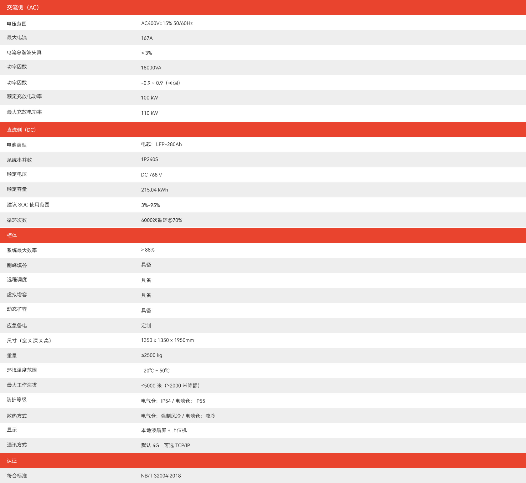 额定电量 215.04kWh,额定功率 100kW, 电池循环寿命达 6000 次